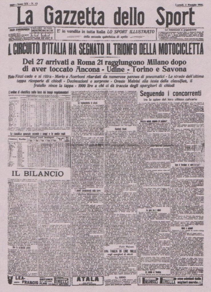 La competizione esclusivamente riservata alle moto ha preso origine dal primo Circuito d’Italia organizzato nel 1914 dall’Unione Sportiva Milanese e dalla Gazzetta dello Sport, che fu il primo giro motociclistico della Penisola[2][3].