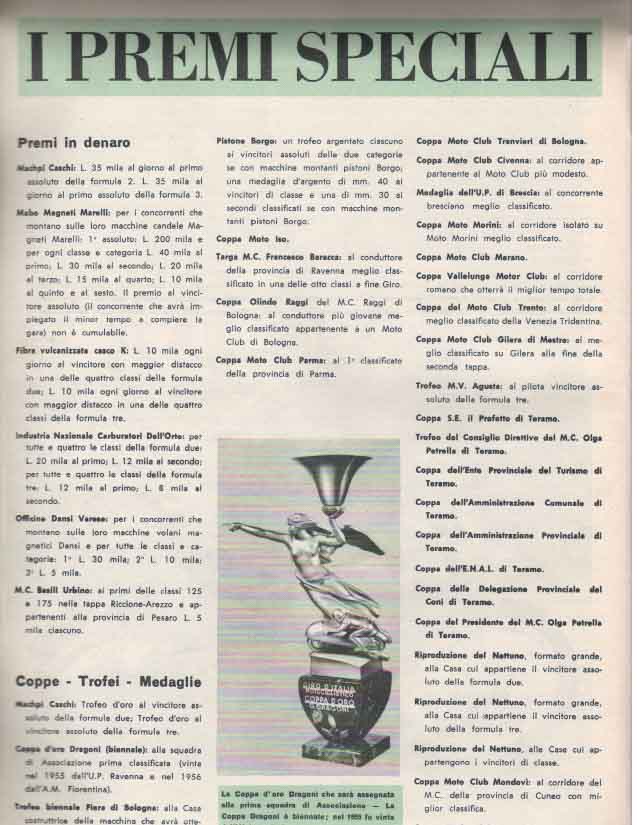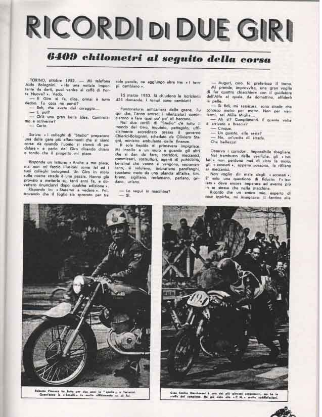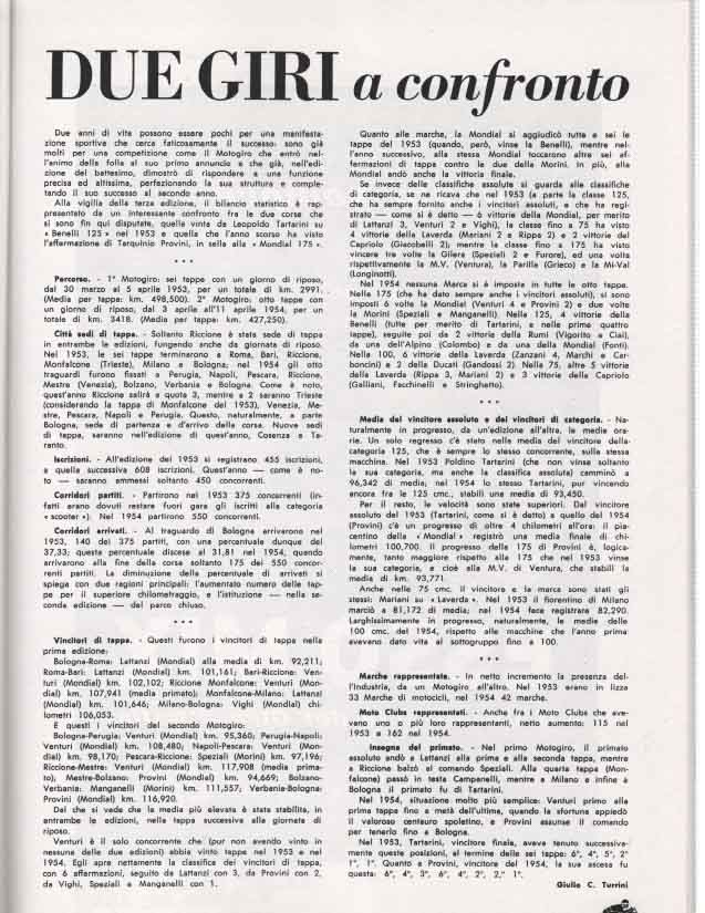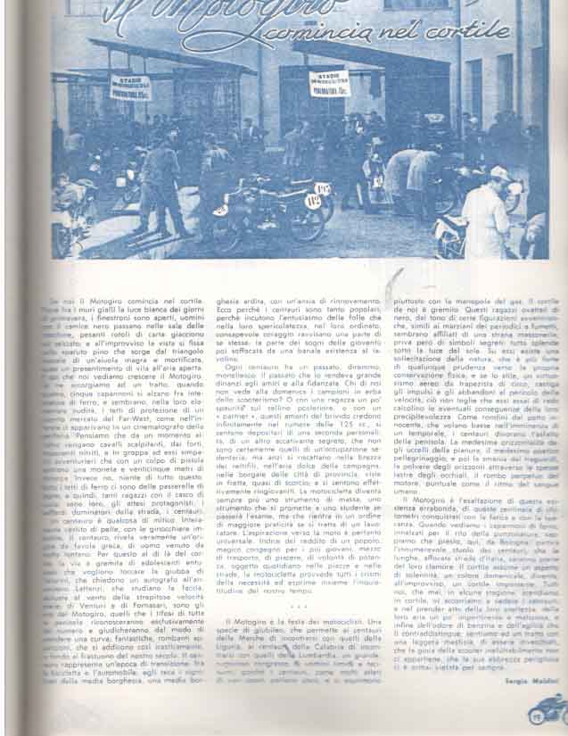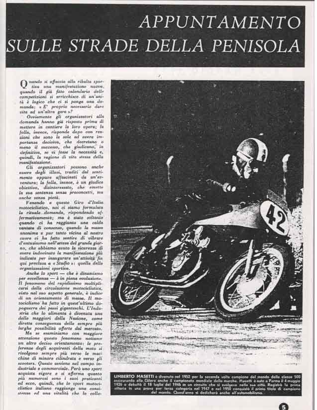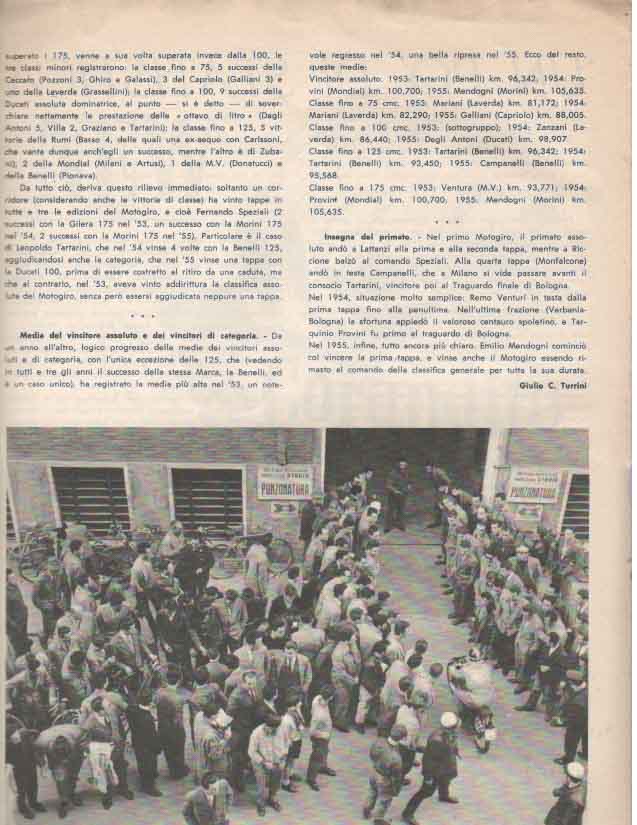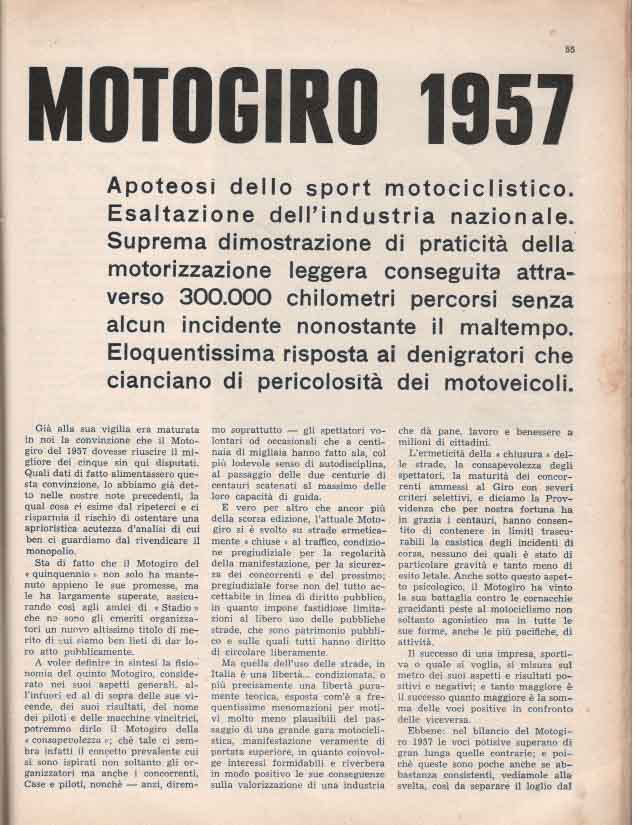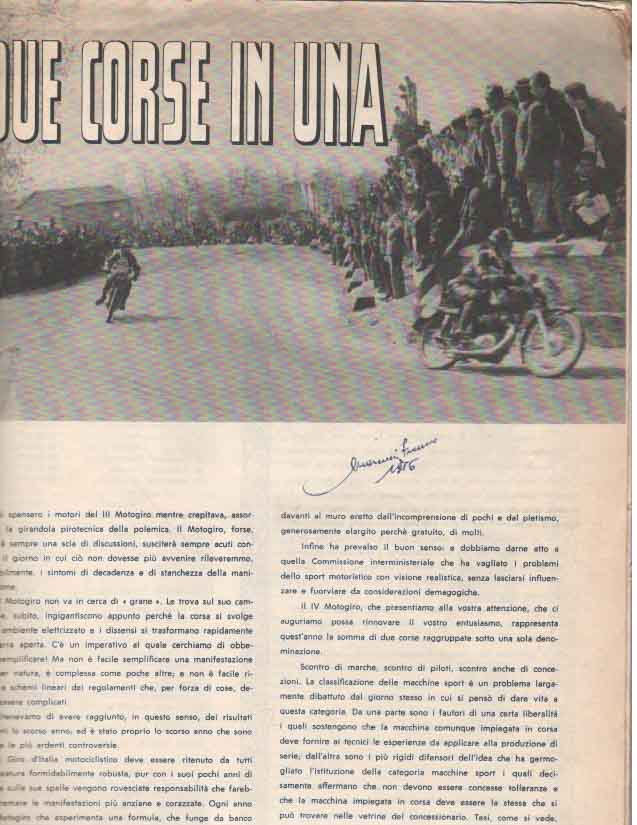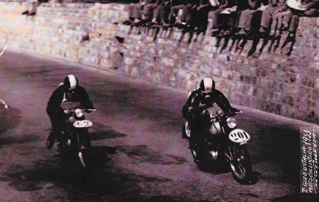 Il Motogiro venne corso dal 1953 al 1957, anno in cui le corse su strade cittadine vennero proibite a causa dell’ incidente di De Portago alla Mille Miglia.