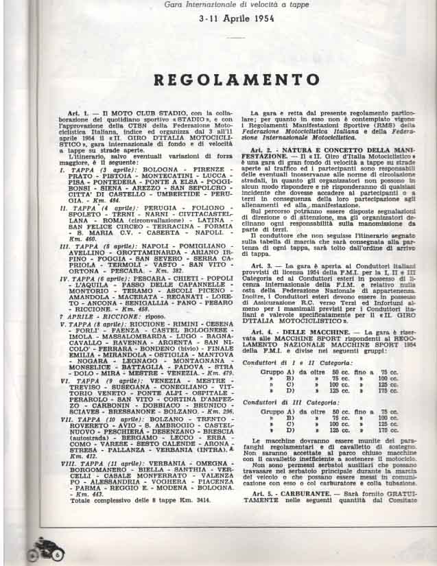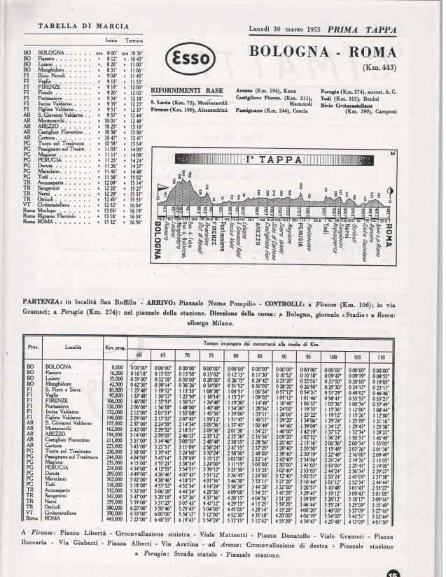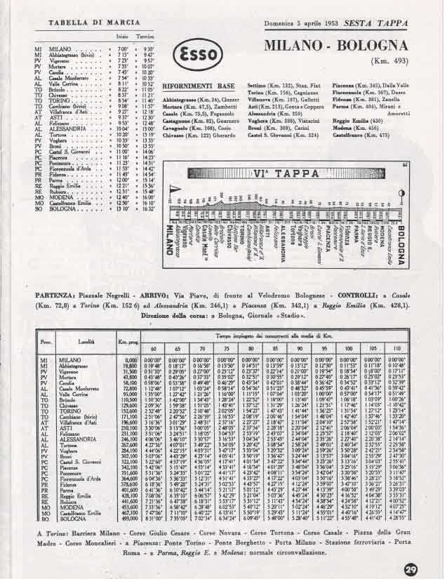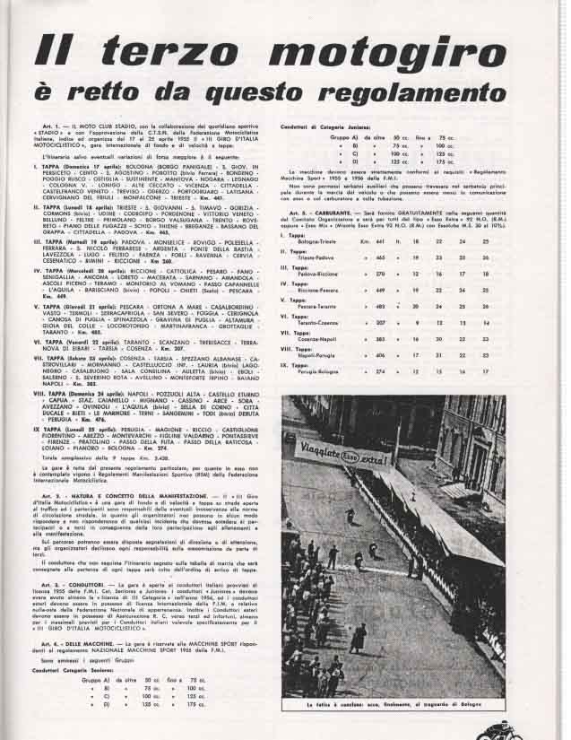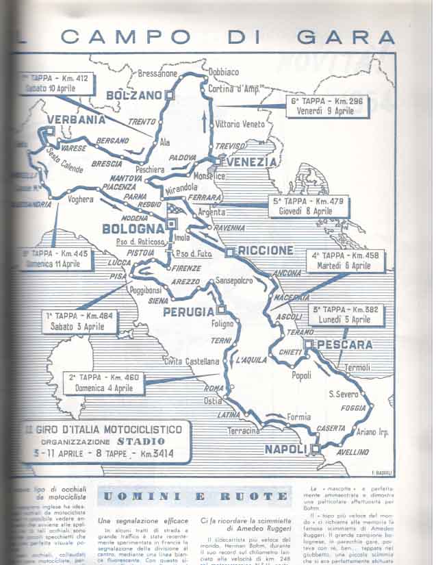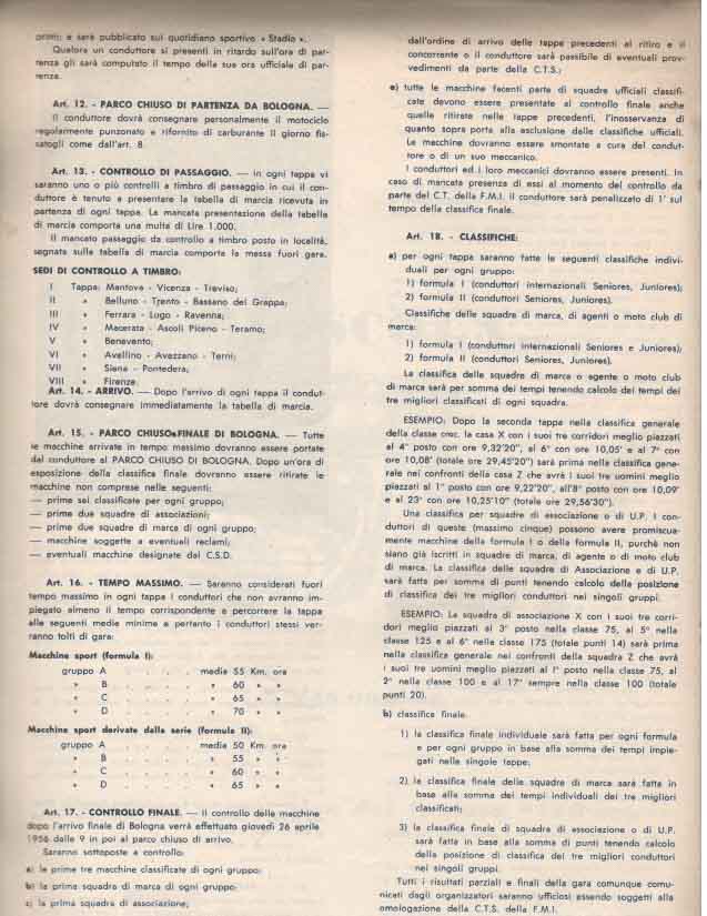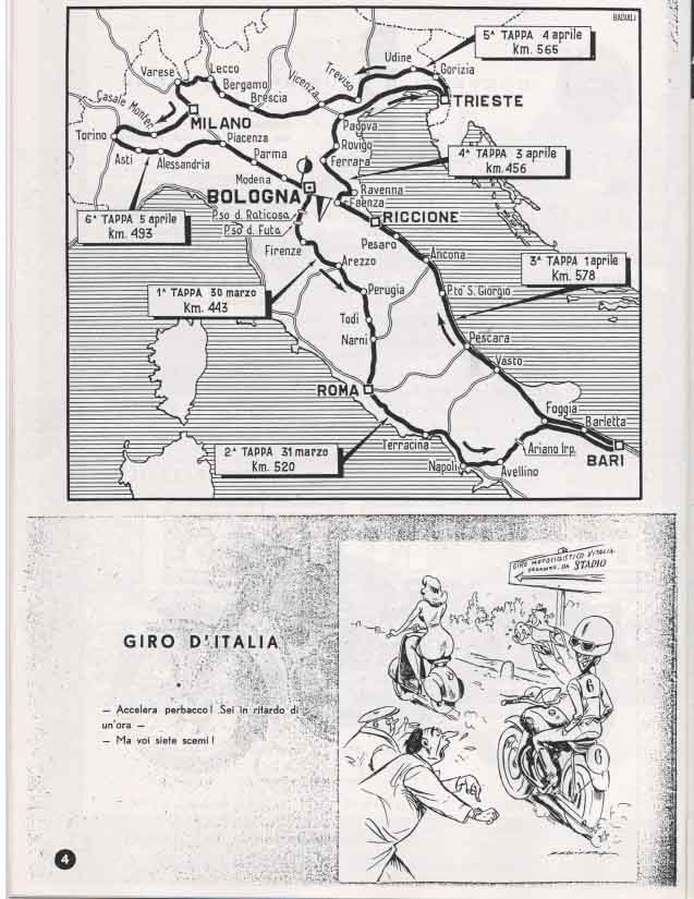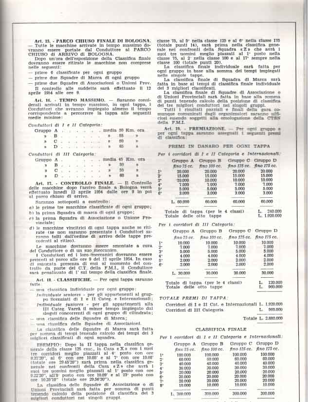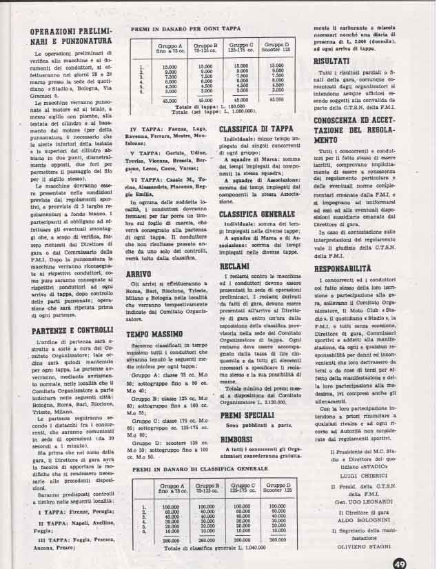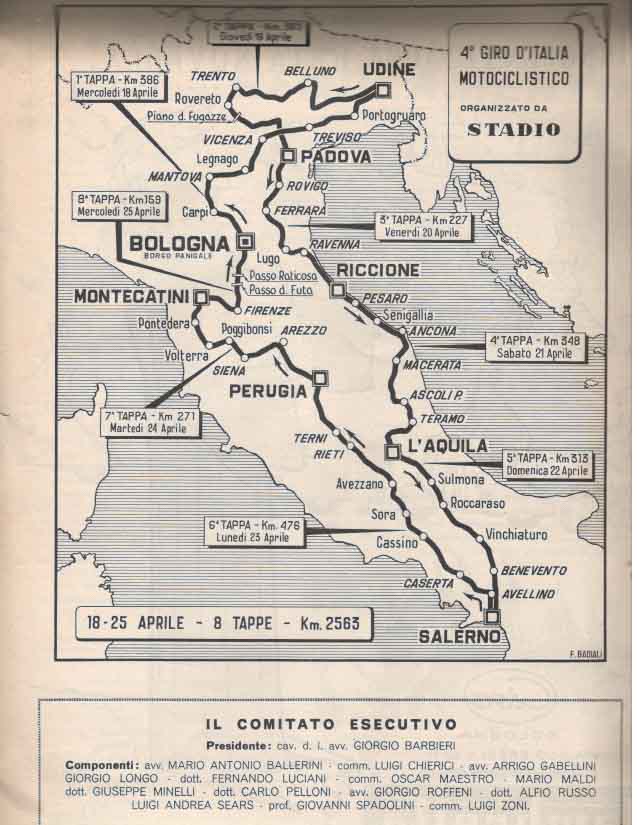 La partenza e l’ arrivo si tenevano a Bologna, e la durata media della gara, divisa a tappe da percorrere in sei giorni, era di circa 3000 km.