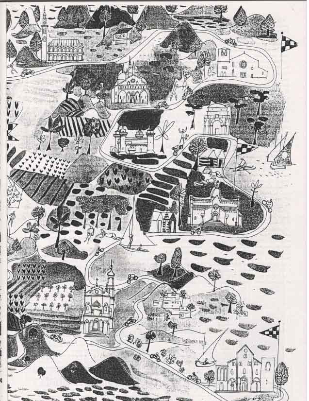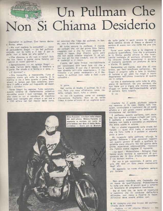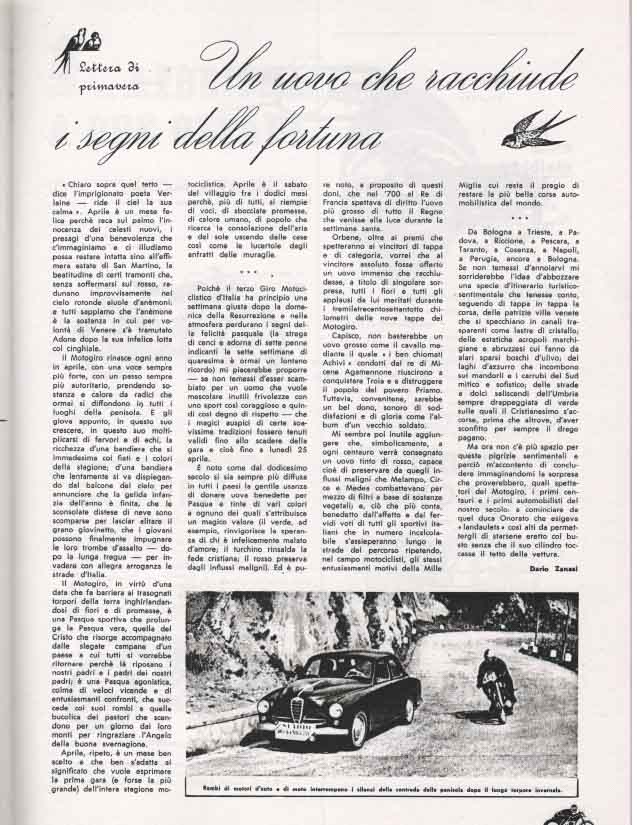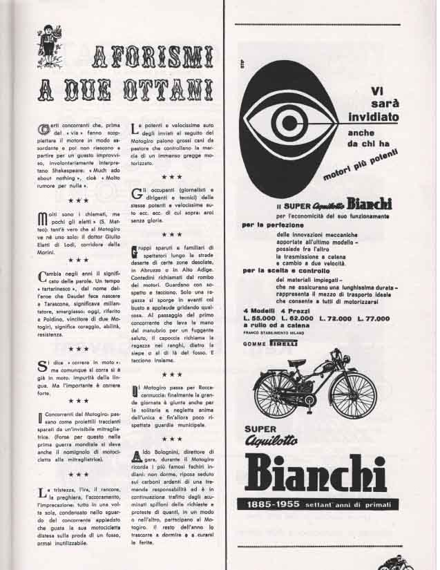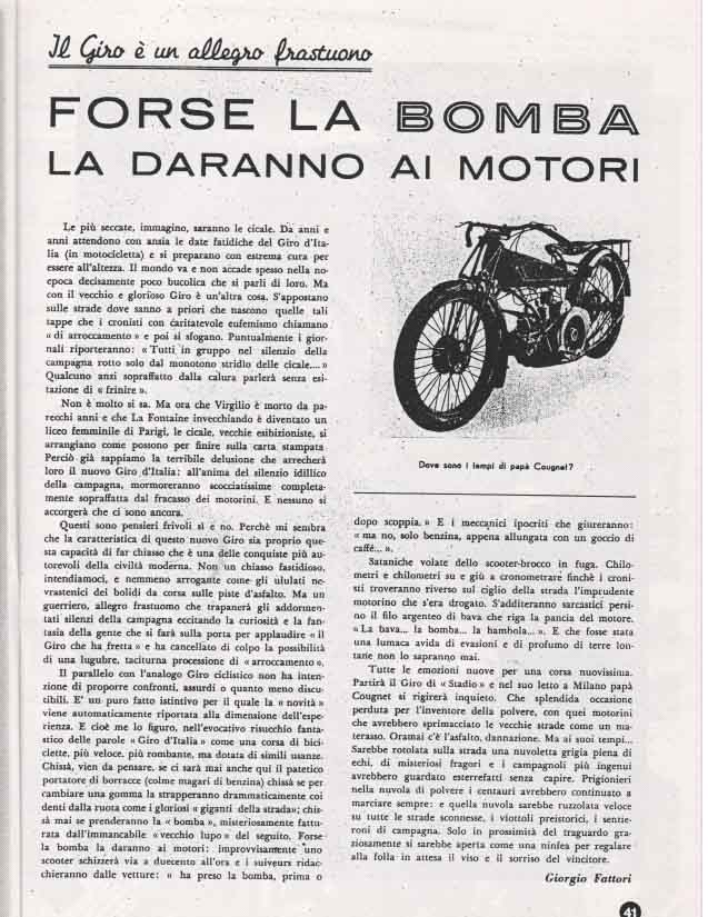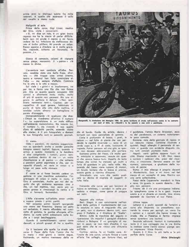 "Frenando alle curve per poi lanciarsi di nuovo in rettilineo, i corridori in salita procedono a strappi, come gocce di pioggia sui vetri. Questo è il giro la più bella e perfida delle corse"