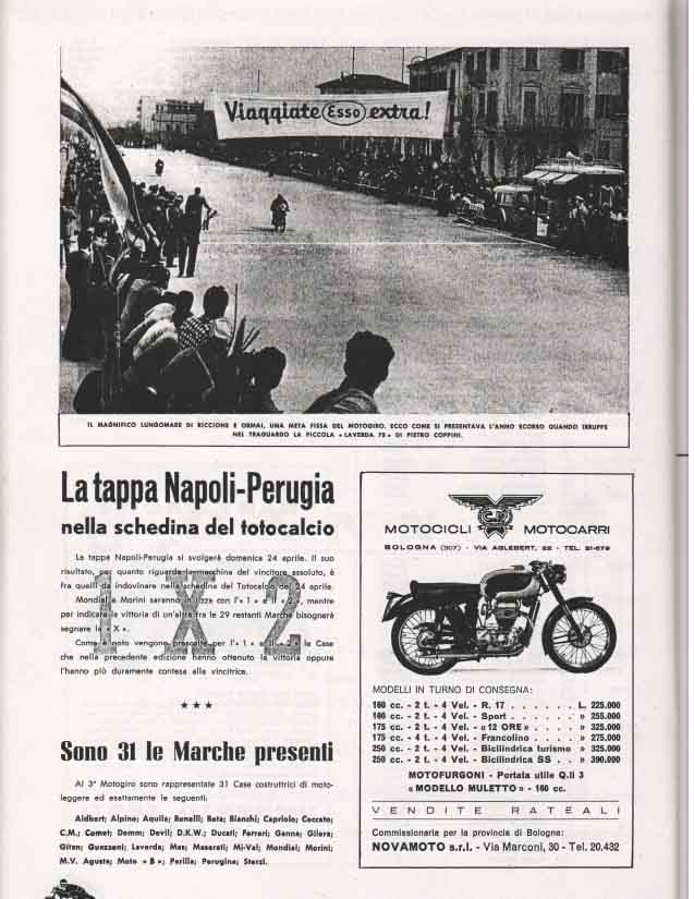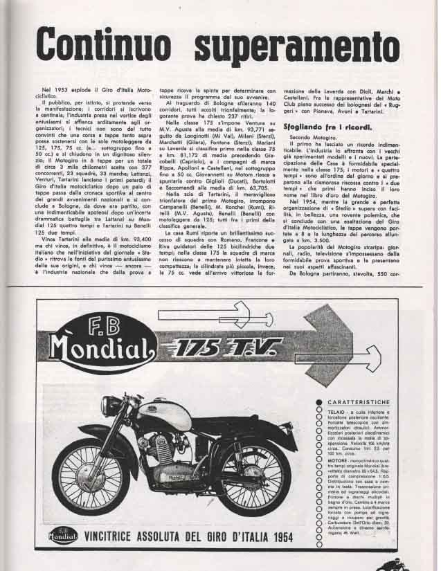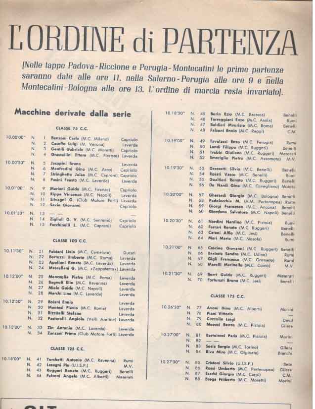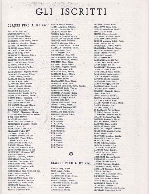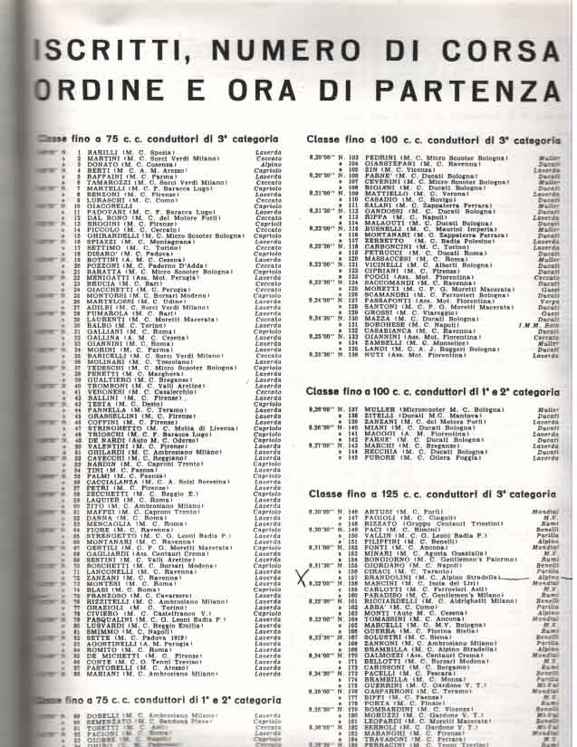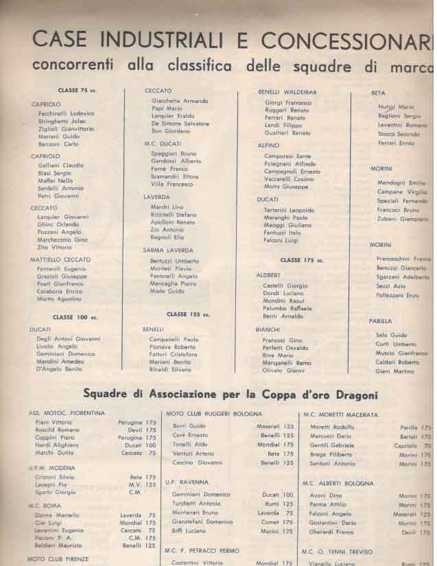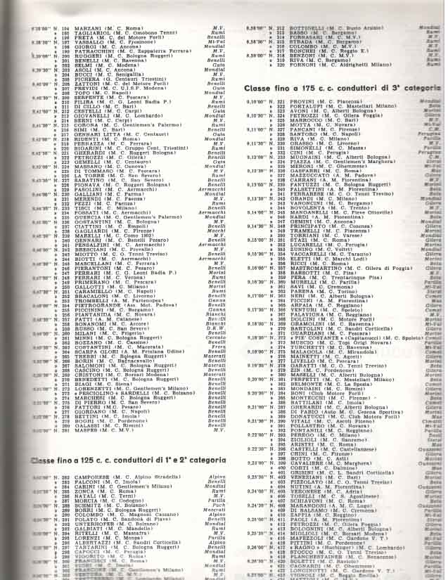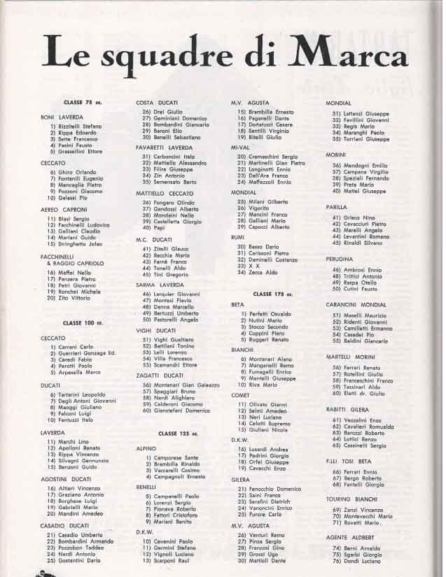 Le grandi case motociclistiche come Benelli, Ducati, Laverda, Moto Morini, MV Agusta, Mondial, si contendevano la vittoria in categorie che andavano dalla classe 75 cc fino alle 175 cc.