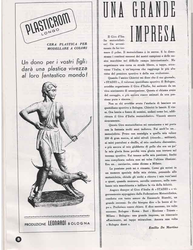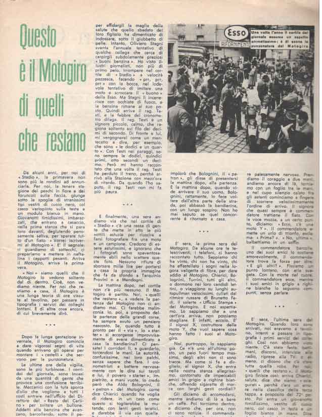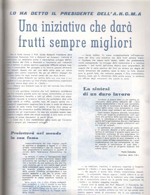 La manifestazione richiamava un numero impressionante di appassionati. Nel corso dell’ anno, il Motogiro d’Italia era la prima manifestazione che si teneva per le strade italiane, nei mesi di Marzo – Aprile, seguito dalla Mille Miglia che si correva a Maggio, per continuare con la Milano Taranto a Luglio.